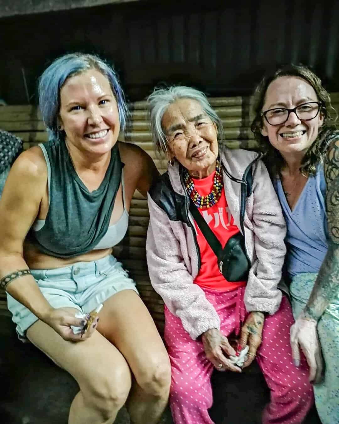 We started in Manila and took a 12-hour bus to Bontoc, where we got a Jeepney for 1 hour to Bugnay. There, we met our guide Francis. From there, we hiked 3.5 miles to her Village. We spent two nights in the village waiting to meet Apo. While we were waiting, we got tattooed by her nieces. Her nieces have learned the technique from Apo.ย